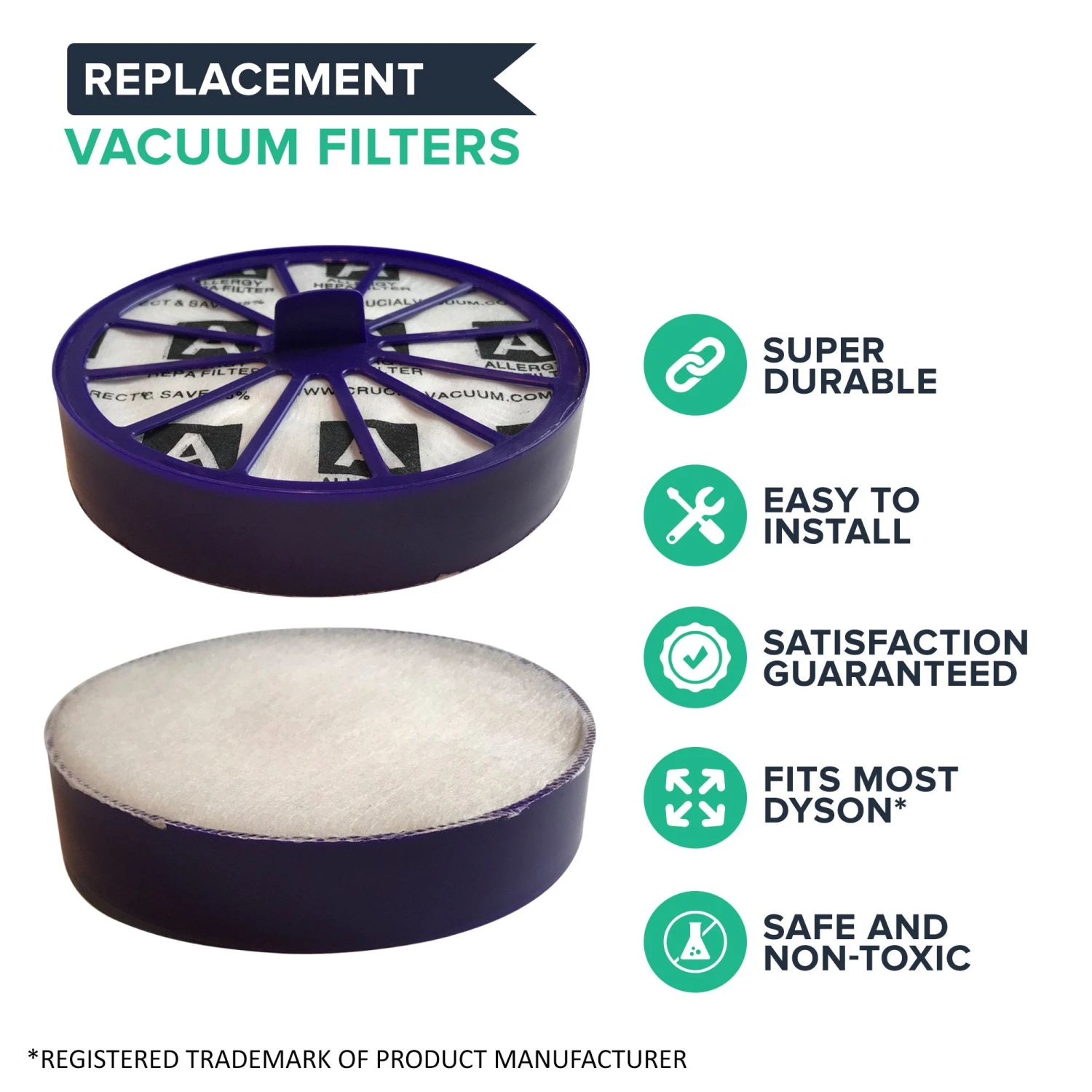 Please note the following important information about this product from Think Crucial: (i) it is a generic replacement, NOT a Dyson® Original Equipment Manufacturer (OEM) product; (ii) because it is not a Dyson® OEM product, it is not covered by any Dyson® guarantee or warranty; (iii) use of this generic replacement may violate or void Dyson’s® guarantee or warranty – it is entirely your responsibility to check, and entirely your risk if you decide to use this product; (iv) we do not guarantee or warrant that this generic replacement is compatible with any product from Dyson® or any other provider. Please check your manufacturer’s warranty with regard to the use of non-OEM parts. Think Crucial provides no warranty or guarantee with regard to the product or its compatibility with your Dyson® product. The Dyson® brand and all Dyson® trademarks belong to Dyson® or its affiliates, and are used here only to explain the compatibility features of the generic replacement product.