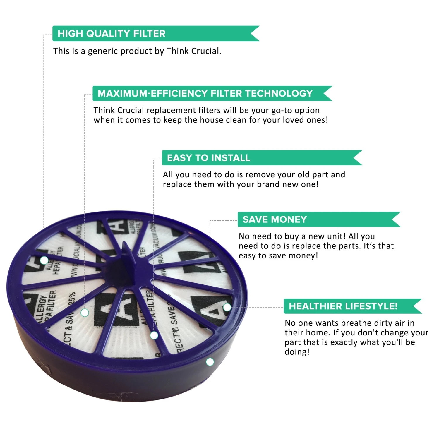 Please note the following important information about this product from Think Crucial: (i) it is a generic replacement, NOT a Dyson® Original Equipment Manufacturer (OEM) product; (ii) because it is not a Dyson® OEM product, it is not covered by any Dyson® guarantee or warranty; (iii) use of this generic replacement may violate or void Dyson’s® guarantee or warranty – it is entirely your responsibility to check, and entirely your risk if you decide to use this product; (iv) we do not guarantee or warrant that this generic replacement is compatible with any product from Dyson® or any other provider. Please check your manufacturer’s warranty with regard to the use of non-OEM parts. Think Crucial provides no warranty or guarantee with regard to the product or its compatibility with your Dyson® product. The Dyson® brand and all Dyson® trademarks belong to Dyson® or its affiliates, and are used here only to explain the compatibility features of the generic replacement product.