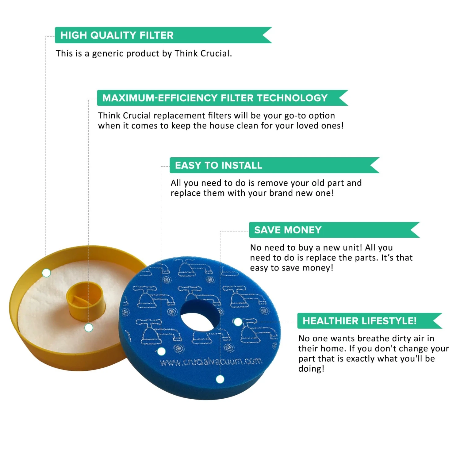 Please note the following important information about this product from Think Crucial: (i) it is a generic replacement, NOT a Dyson® Original Equipment Manufacturer (OEM) product; (ii) because it is not a Dyson® OEM product, it is not covered by any Dyson® guarantee or warranty; (iii) use of this generic replacement may violate or void Dyson’s® guarantee or warranty – it is entirely your responsibility to check, and entirely your risk if you decide to use this product; (iv) we do not guarantee or warrant that this generic replacement is compatible with any product from Dyson® or any other provider. Please check your manufacturer’s warranty with regard to the use of non-OEM parts. Think Crucial provides no warranty or guarantee with regard to the product or its compatibility with your Dyson® product. The Dyson® brand and all Dyson® trademarks belong to Dyson® or its affiliates, and are used here only to explain the compatibility features of the generic replacement product.