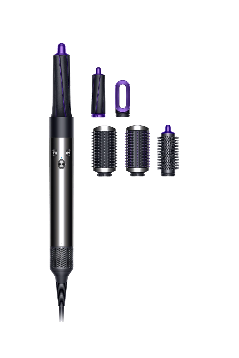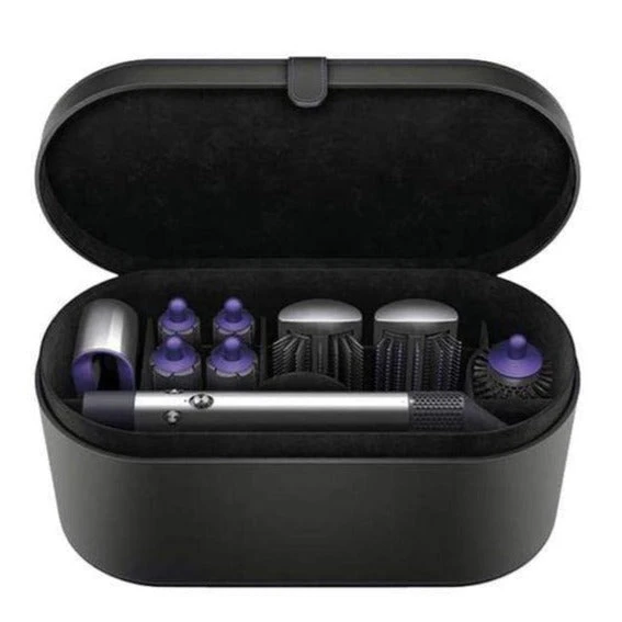 Exclusive Black & Purple colour. The Dyson Air wrap styler attracts and wraps hair for you, using air. Harnessing an aerodynamic phenomenon called the Coanda effect, it curves air to attract hair to the barrel No clamping, gloves or awkward winding mechanisms. Just calumnious curls and waves. Set includes: 1 x Styler, 1 x 30mm Air wrap barrel, 1 x 40mm Air wrap barrel, 1 x Firm smoothing brush, 1 x Soft smoothing brush, 1 x Round volumizing brush, 1 x Pre-styling dryer, 1 x Non-slip heat-resistant mat and 1 x Tan storage case.